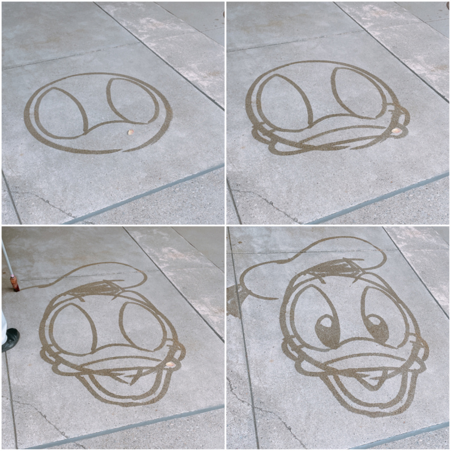 ほうきと水を使って地面に絵を描く